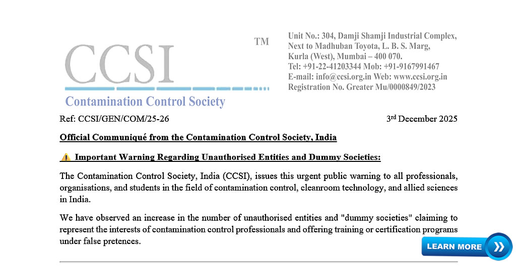 Contamination Control Society, India (CCSI) is a member and affiliate of ICCCS (International Confederation of Contamination Control Societies)