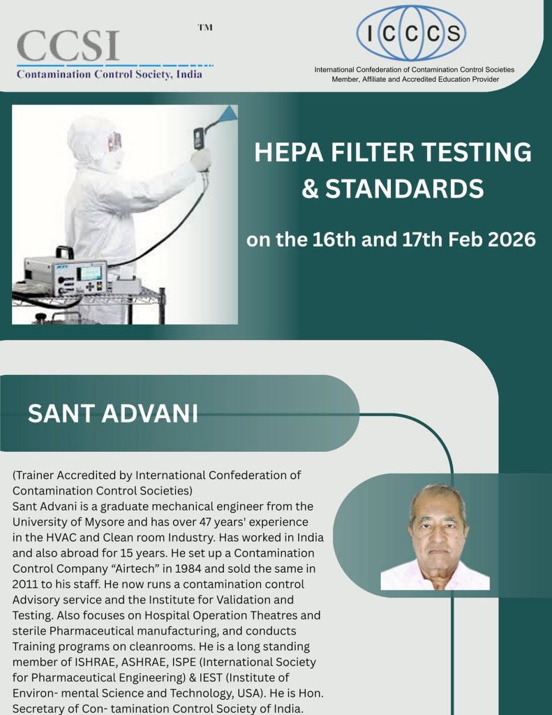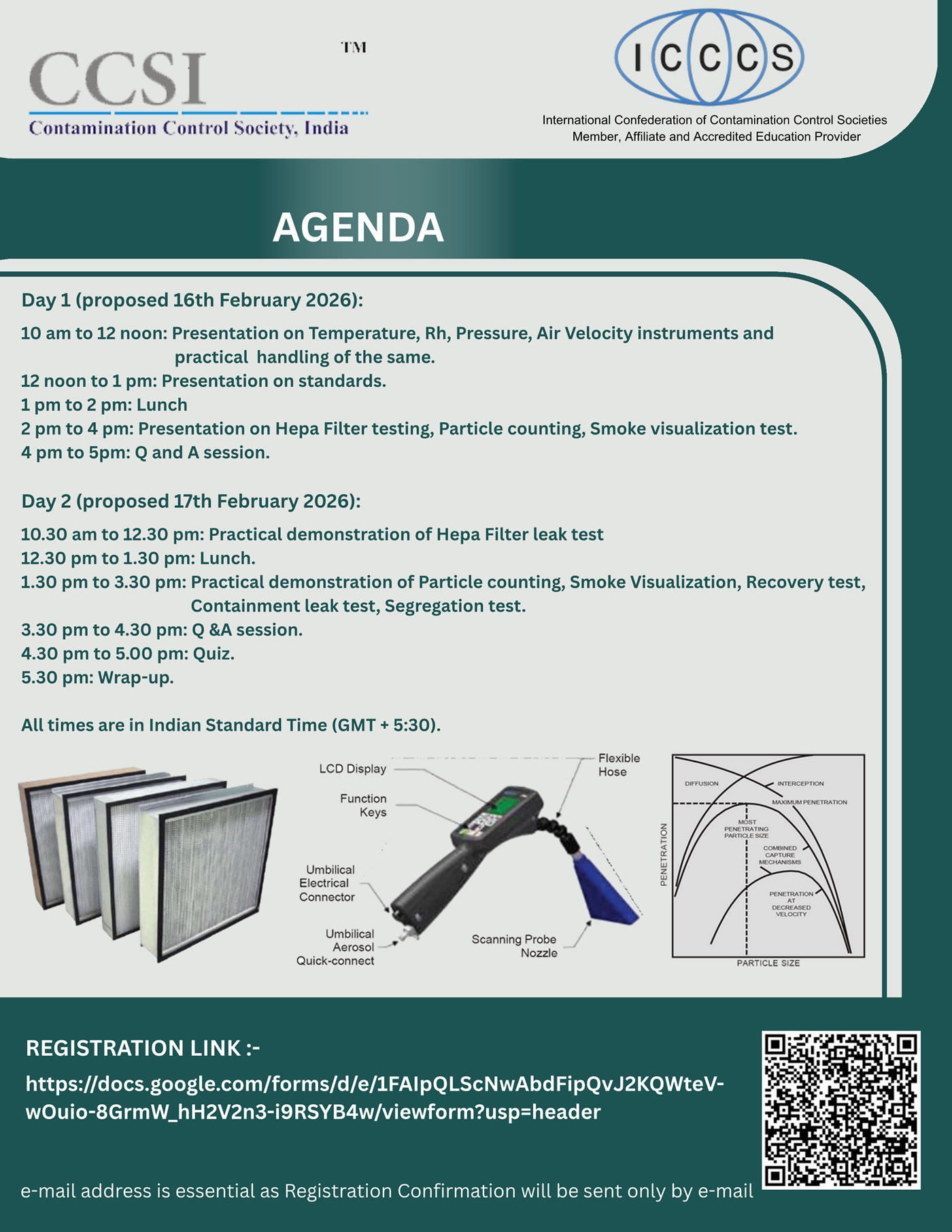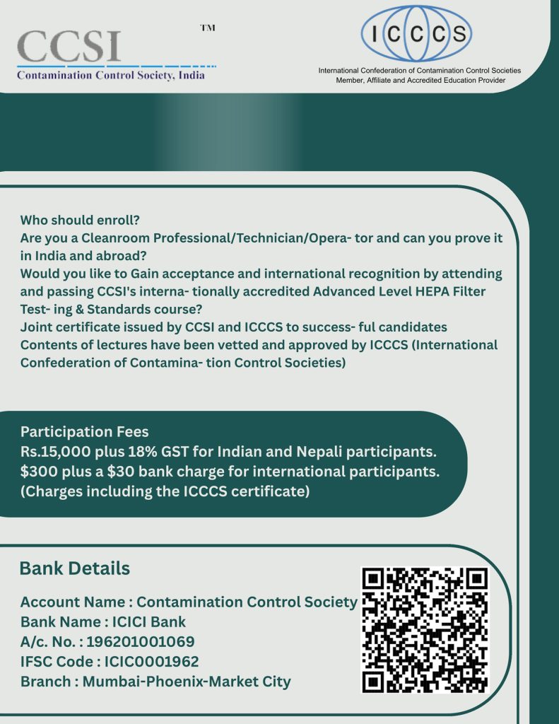 The program is conducted by the Contamination Control Society of India (CCSI) and is affiliated with ICCCS. The certification awarded is globally valid for five years.
